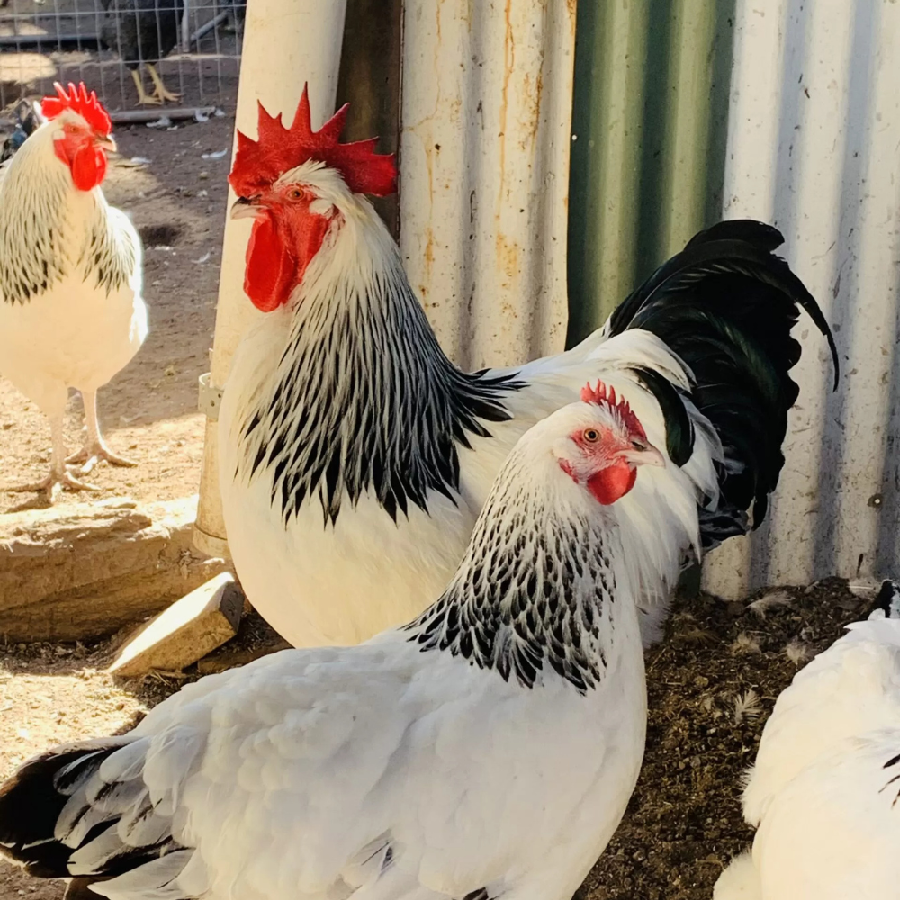 Light Sussex The Sussex chicken is a graceful and calm dual purpose breed that can adapt to any surroundings and be quite tame and friendly. Happy to free range or to be penned. They do occasionally go broody in the warmer months.